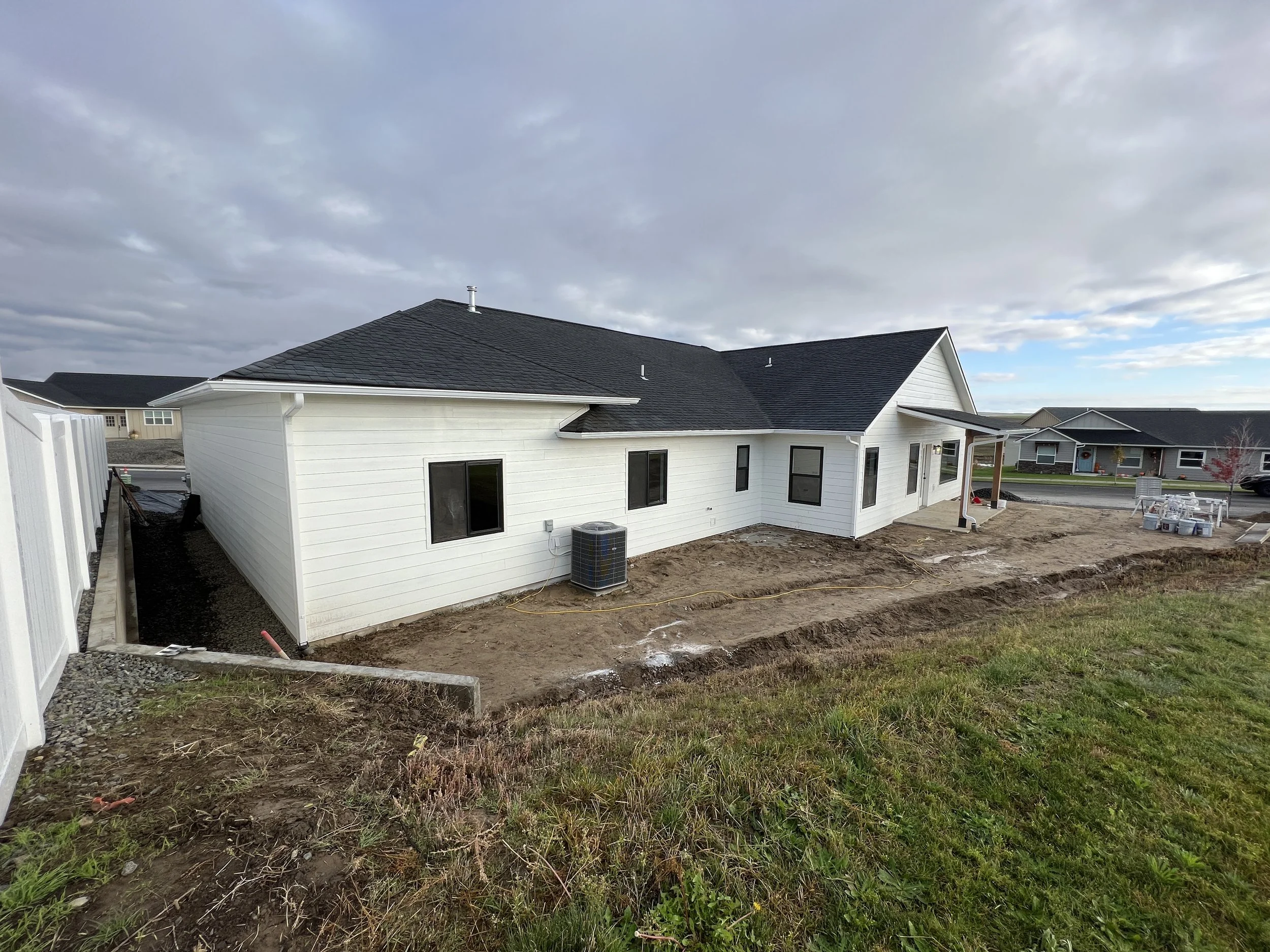 This is before the house was completely finished. There is now lush green grass and a white fence enclosing the yard, providing privacy for the covered patio and lawn.